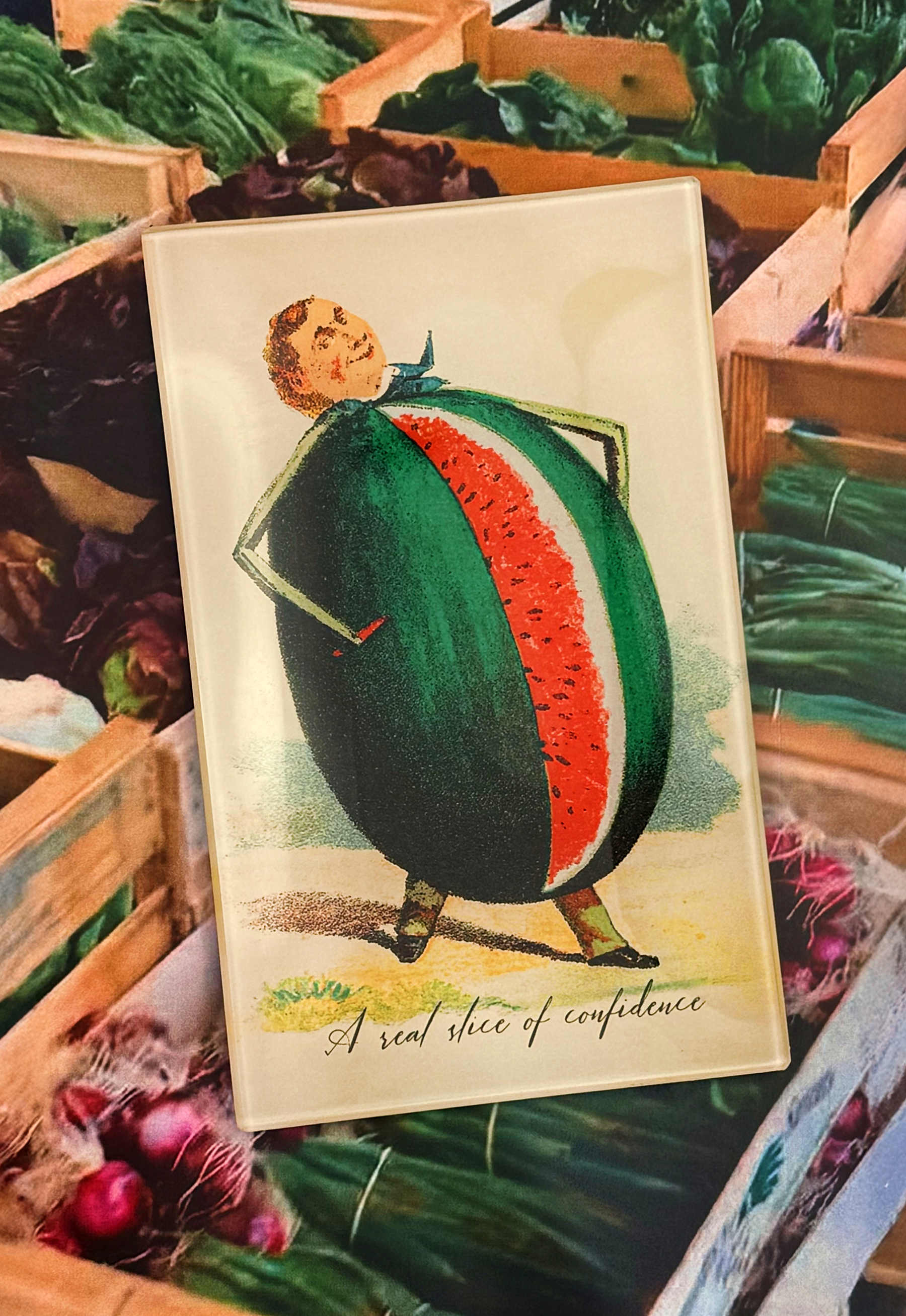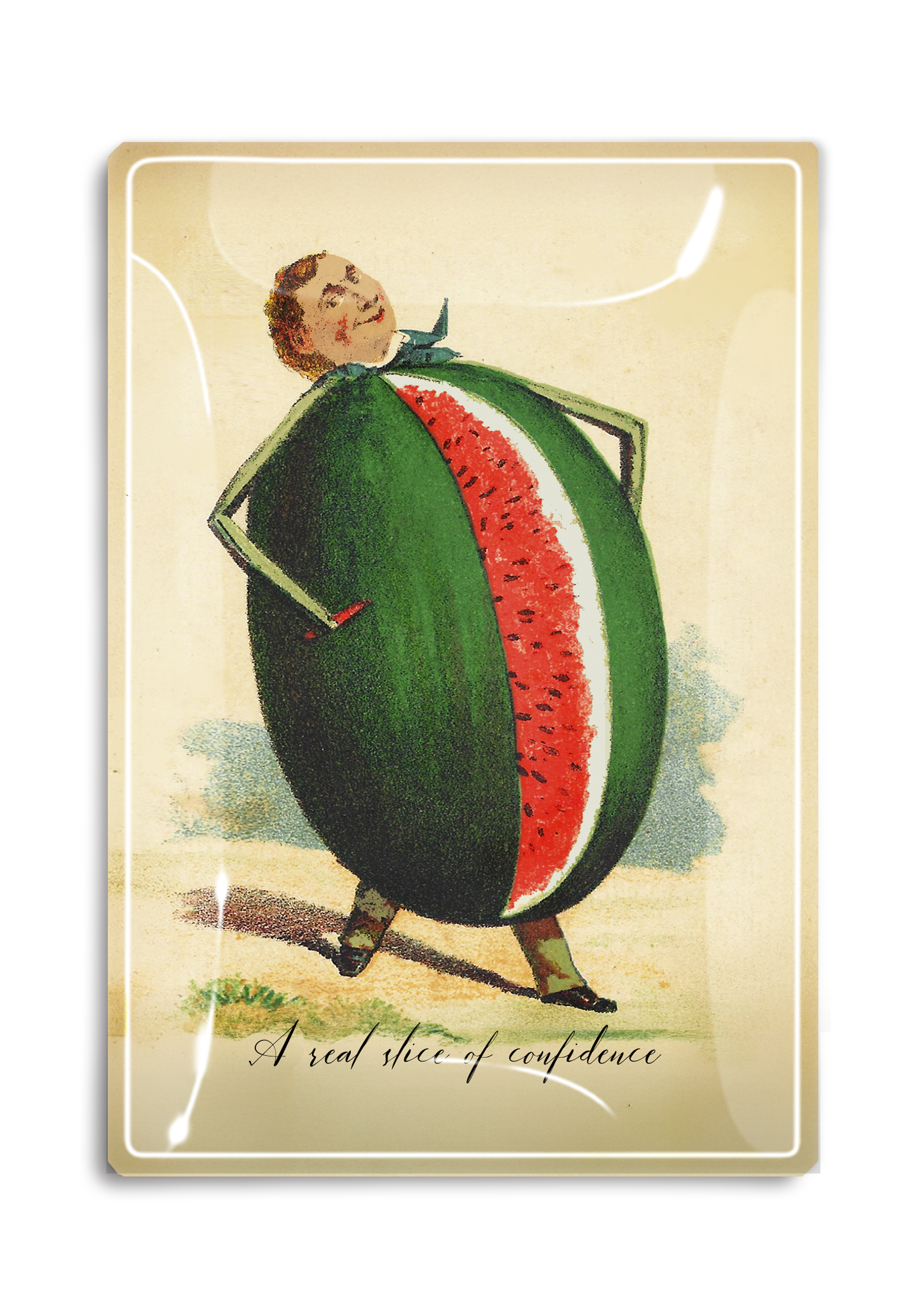 Confidence, plated. A jaunty gentleman in a watermelon suit strides across a warm cream field, a vintage wink that turns any surface into a small stage. It feels like summer swagger captured under glass, the kind of charm that makes people smile and reach for their phones.