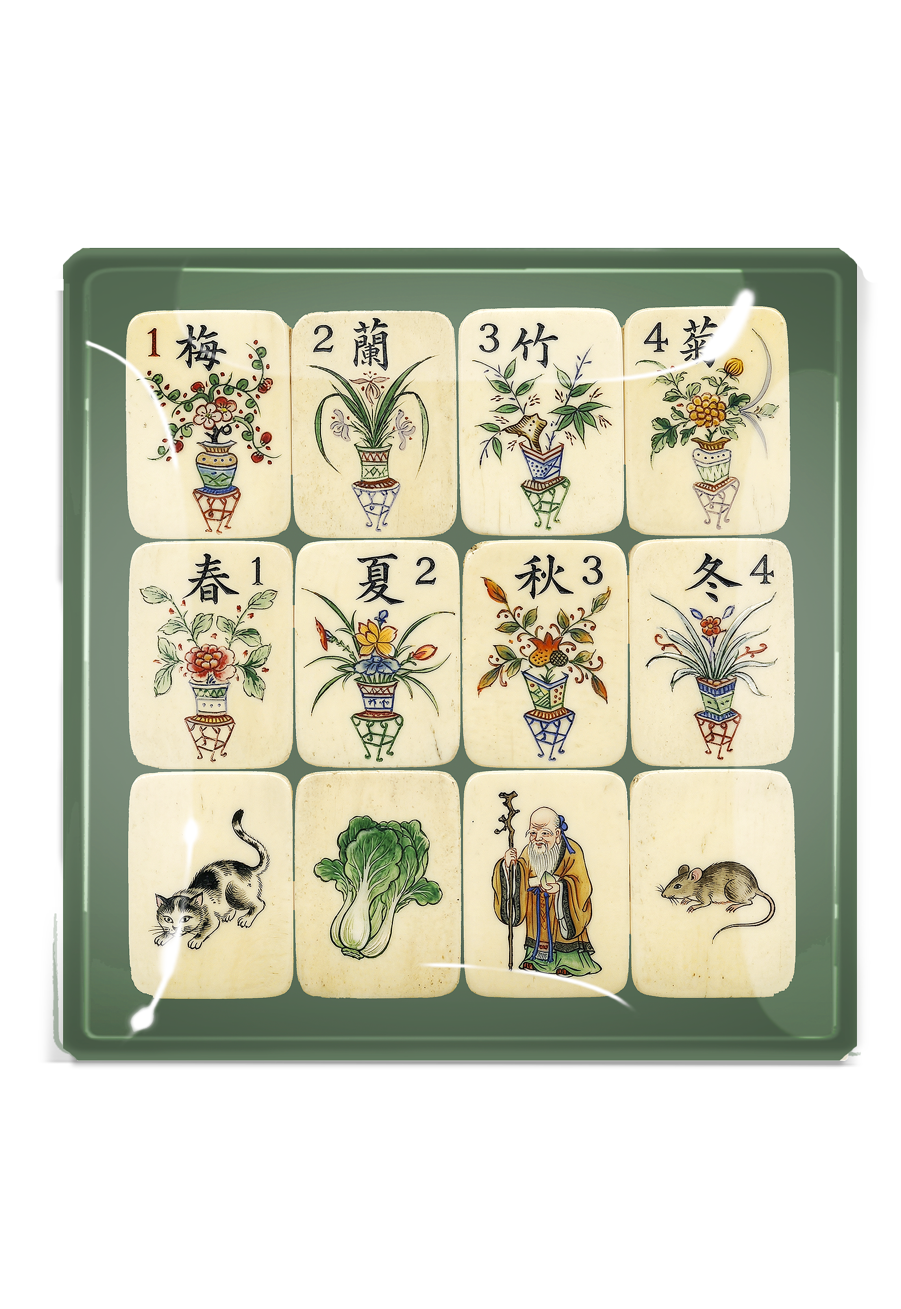 A quiet garden behind palace walls. Plum blossoms in porcelain pots. Bamboo bending in the wind. The turning of the seasons marked not by clocks, but by petals and patience. This tray gathers a tableau of Imperial Mahjong tiles—floral emblems, scholars, creatures and symbols—each one a small meditation on fortune, resilience, and grace.