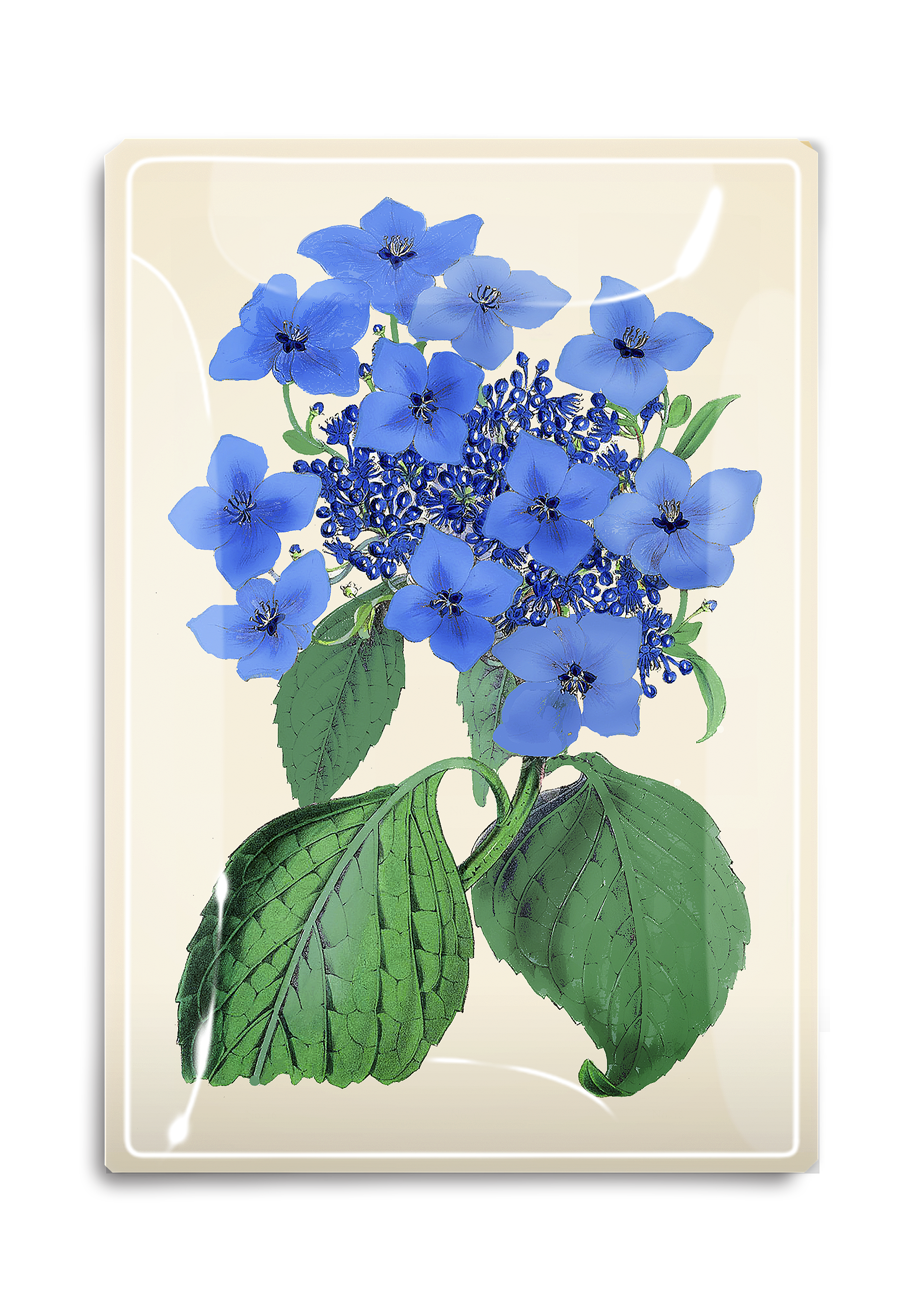 A garden classic, rendered with restraint and romance. Delicate blue lace hydrangea blossoms unfold across the surface, their soft petals and inky centers layered against lush green leaves. The effect is calm and considered, familiar yet quietly transportive, like a pressed flower rediscovered in the pages of an old book. It’s floral, but not precious; timeless, without trying too hard.