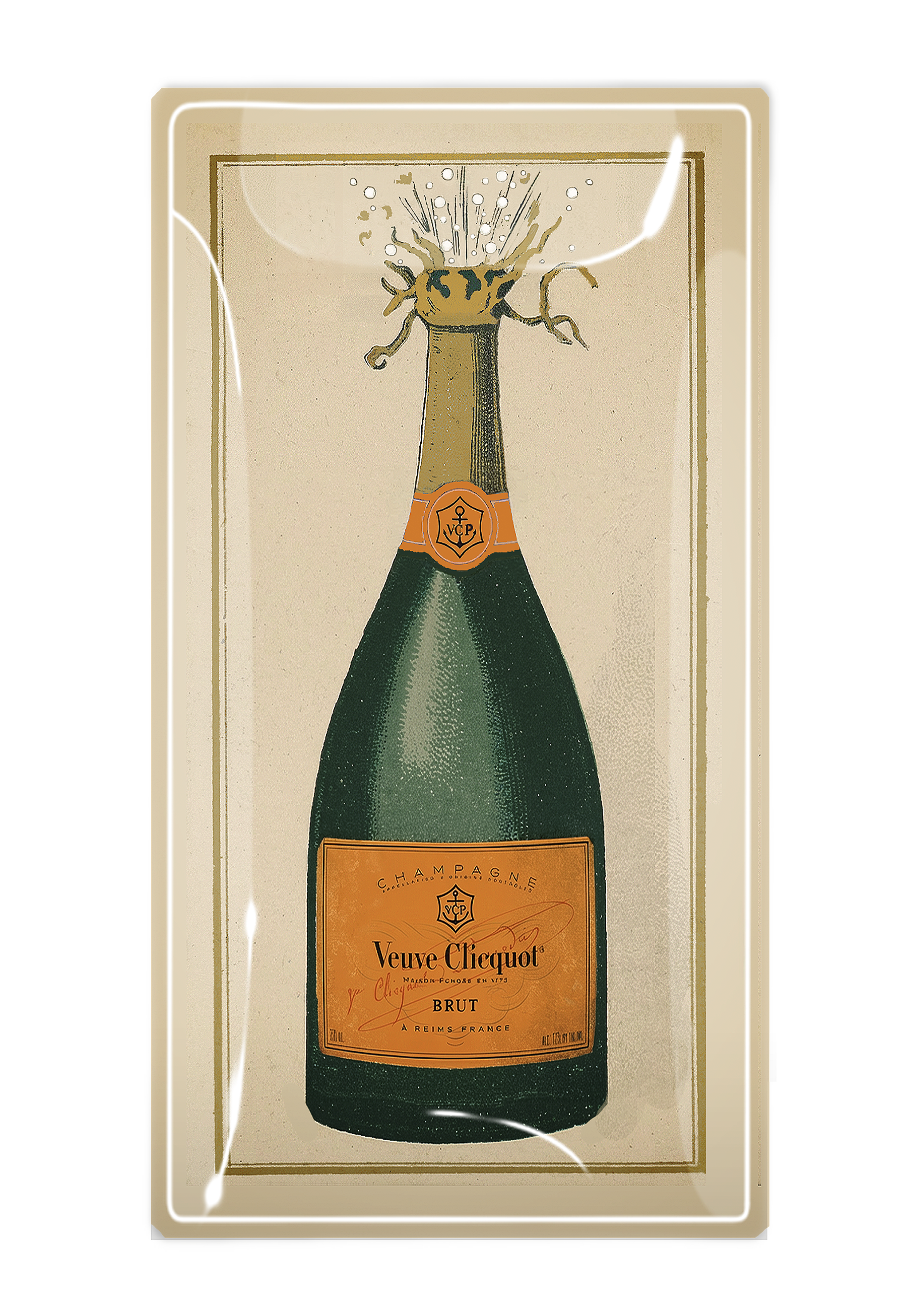 This iconic Veuve Clicquot Brut — rendered from a vintage French label study — captures that exact suspended second: the cork mid-flight, the fizz rising, the promise of something worth toasting. Golden ochre against deep emerald glass, bordered in a soft parchment frame, it feels like a love letter to celebration itself. Equal parts heritage and mischief, it brings the romance of champagne houses and late-night clinking glasses into the everyday.